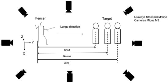 Data were collected using 3D motion analysis. During each trial, tracking markers (14.0 mm diameter) affixed on the skin of each fencer were photographed and the 3D coordinate values were measured using analysis software. Eight motion cameras (Qualisys Standard Motion Cameras Miqus M3, Goteborg, Sweden) were placed around the fencer and the sampling frequency was set to 500 Hz. The captured data were stored in Qualisys Track Manager (QTM) through a dedicated cable. In this study, a stationary coordinate system was used in which the Y-axis is the direction in which the lunge is moving, the X-axis is orthogonal to the Y-axis, and the Z-axis is vertical. The fencer wore a fencing mask on their head and held a foil in their dominant hand. In this study, based on the Visual 3D Marker Set Guidelines, a total of 51 tracking markers were affixed, including 44 points surrounding the joints of the upper and lower limbs and 7 points on the foil (top of the blade, near the top, center of the blade, near guard, and guard [guard center, guard right, guard left]) (Figure 1). Foils (No. 5, BF Allstar, Reutlingen, Germany, 90 cm blade length) and masks (Allstar, Reutlingen, Germany) were standardized according to international standards and the shoes were those normally used by each individual. Figure 2 shows the experimental setup.