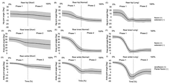 Generalized pattern of rear leg joint angles in the lunge motion from the sagittal plane (N = 15). Note: (A) Rear leg hip motion pattern in short conditions. (B) Rear leg hip motion pattern in normal conditions. (C) Rear leg hip motion pattern in long conditions. (D) Rear leg knee motion pattern in short conditions. (E) Rear leg knee motion pattern in normal conditions. (F) Rear leg knee motion pattern in long conditions. (G) Rear leg ankle motion pattern in short conditions. (H) Rear leg ankle motion pattern in normal conditions. (I) Rear leg ankle motion pattern in long conditions.