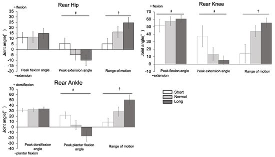 Summary of motion data at the lower extremity joint (hip, knee, and ankle) angles of the rear leg viewed from the sagittal plane (N = 15; in degrees). Note: Data are presented as Mean ± SD. Error bars indicate ± standard deviation. Hip, Knee, + = flexion/− = extension; Ankle, + = dorsiflexion/− = plantar flexion. ♯, analysis of variance; †, Friedman’s test was applied because normal distribution was not given.
