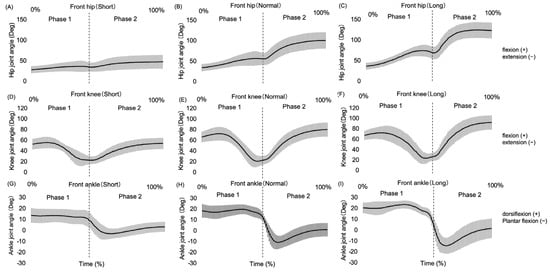 Generalized pattern of front leg joint angles in the lunge motion from the sagittal plane (N = 15). Note: (A) Front leg hip motion pattern in short conditions. (B) Front leg hip motion pattern in normal conditions. (C) Front leg hip motion pattern in long conditions. (D) Front leg knee motion pattern in short conditions. (E) Front leg knee motion pattern in normal conditions. (F) Front leg knee motion pattern in long conditions. (G) Front leg ankle motion pattern in short conditions. (H) Front leg ankle motion pattern in normal conditions. (I) Front leg ankle motion pattern in long conditions.