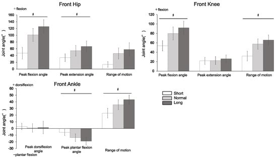 Summary of motion data at the lower extremity joint (hip, knee, and ankle) angles of the front leg viewed from the sagittal plane (N = 15; in degrees). Note: Data are presented as Mean ± SD. Error bars indicate ± standard deviation. Hip, Knee, + = flexion/− = extension; Ankle, + = dorsiflexion/− = plantar flexion. ♯, analysis of variance.