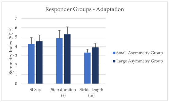 Comparison of small and large asymmetry-responder groups during the adaptation condition. Note: SLS % = Single limb support %.
