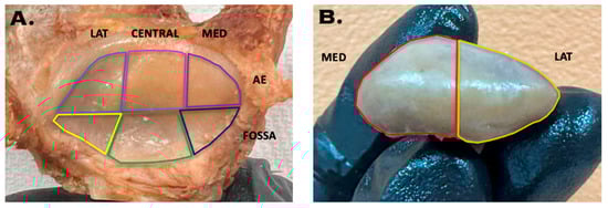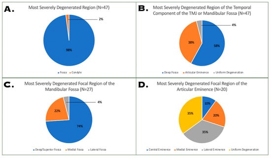 In previous investigations, chondral lesions were assessed using the validated scale for OA disease severity on the mandibular fossa and mandibular condyle without regard for the specific, focal sites of degeneration. Specific regions on specimen condyles and fossae were noted in this study as many presenting cartilage lesions do not cover the entirety of an individual specimen and may vary based on lesion etiology. The deepest focal lesions on specimen mandibular condyles can be assessed to present on the medial condyle, lateral condyle or across the entirety of the condyle. The deepest focal lesions on specimen mandibular fossae can be assessed to present on the articular eminence or on the true, more posteriorly located, fossa. The articular eminence may demonstrate its most severe signs of pathology on the medial aspect, the central aspect, the lateral aspect, or across the entirety of the articular eminence. The true mandibular fossa may demonstrate its most severe signs of pathology on the deepest aspect of the fossa, the lateral periphery, the medial periphery or on the entirety of the fossa (