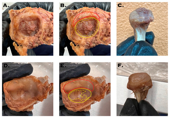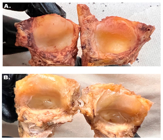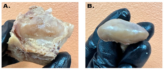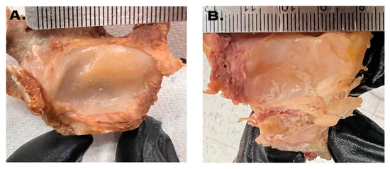 Each TMJ was photographed using a 12-megapixel iPhone 13 Pro camera. Each image included a drafting ruler for calibration. First, the TMJ condyle was photographed from the anterior, medial, lateral, and posterior views. Each condyle specimen was photographed on two different backgrounds to allow for better interpretation of the gross signs of OA. After disarticulation from the temporal bone, the mandibular fossa was placed on the benchtop and photographed from above on two different backgrounds, ensuring a clear view of the deep articular fossa and the articular eminence.
