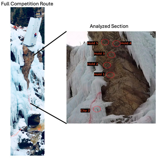 The ice-climbing route consisted of a short ice section, followed by a rock face, and it ended on a man-made feature (Figure 1). Two GoPro Hero 5 cameras (GoPro Inc., San Mateo, CA, USA) recorded at 960 p and 120 Hz from fixed locations on an outcropping in the gorge opposite from the climbing route. The cameras were both positioned at a height at the approximate middle of the analyzed section and were about 30 m in horizontal displacement from the climbing route. To provide left and right vantage points of the entire competition route, each camera was positioned approximately 7 m from the center of the route. All participants completed the bottom portion of the route, which consisted of a non-technical traverse, and few completed the upper man-made feature, so the middle portion above clip 2, which was completed by all competitors, was used for analysis. Within this section, participants consistently used five distinct holds, which were selected for analysis (Figure 1). Most participants used additional holds throughout the analyzed section; however, these holds were not analyzed due to their inconsistent use among competitors.