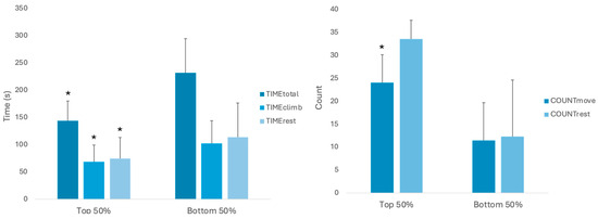 Table 2 provides the spatiotemporal data for the analyzed section. There was a strong significant correlation between competition rank and TIMEtotal (τB = 0.645, p < 0.001) and moderate correlations between TIMEclimb (τB = 0.366, p = 0.004) and TIMErest (τB = 0.320, p = 0.013), with better-performing competitors moving more quickly through the analyzed section of the climb by climbing faster and using shorter rests. Likewise, TIMEtotal, TIMEclimb, and TIMErest were significantly lower for the top 50% of climbers (Figure 3). Additionally, there was a moderate significant correlation between competition rank and the number of moves (τB = 0.473, p < 0.001), with better-performing competitors using fewer moves through the analyzed section of the climb. Likewise, the top 50% of competitors used significantly fewer moves to climb the analyzed section (Figure 3). The number of rests was not significantly correlated to competition rank and did not differ between the top and bottom 50% of competitors.
