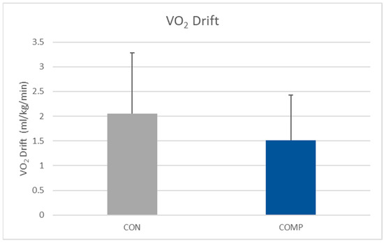 Average VO2 drift for both the Control (CON) and Compression (COMP) conditions. Averages (SE) were calculated as the difference between average VO2 of the first and last five min of steady state running during the 40 min trials.