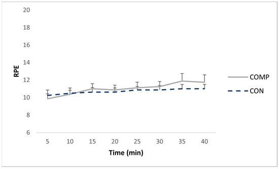 RPE for both Control (CON) and Compression (COMP) conditions. Averages (SE) were calculated every 5 min for the entirety of each condition.