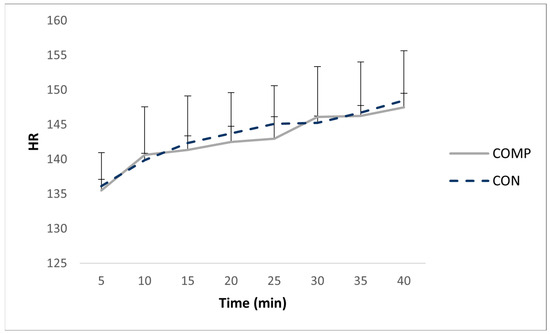 To assess exercise intensity, both a subjective (i.e., RPE) and objective (i.e., HR) measure was used. Using a Condition (2: CON, COMP) by Time (8: 1, 2, 3, 4, 5, 6, 7, 8) repeated measure analysis of variance (ANOVA), both RPE (Figure 3) and HR (Figure 4) were examined. For RPE, neither the Condition (p = 0.22) or Time (p = 0.07) main effects were significant. Additionally, the Condition × Time interaction was non-significant (p = 0.06). The Condition main effect (p = 0.75) for HR was not significant, but there was a significant Time main effect (p < 0.001). Specifically, HR increased throughout both conditions. The Condition × Time interaction was non-significant (p = 0.72).