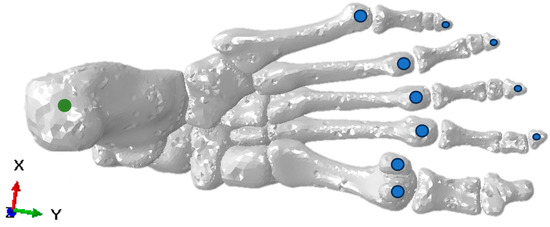 The model was simulated by applying a 720 N load representing the full weight of an adult person of 73.4 kgs during the mid-stance phase, leaning on one foot. The foot load was orientated in a dropping vertical direction, with 10° of inclination distributed in the region of contact tibia–talus (90%) and fibula–talus (10%) [14]. The load used for the tendons in the model was reported in a cadaveric study [15]. The fixed nodes were in four regions for mid- and terminal-stance simulation. The first region was the calcaneus, where fixed nodes restricted movement and displacements in the X, Y, and Z directions. The second, third, and fourth regions were the heads of the metatarsal bones, sesamoids, and distal phalanges, which avoided constraint displacements in the Z axis. This was set to simulate the ground effect. The above descriptions of load conditions and fixed nodes can be seen in Figure 2 and Figure 3, respectively.