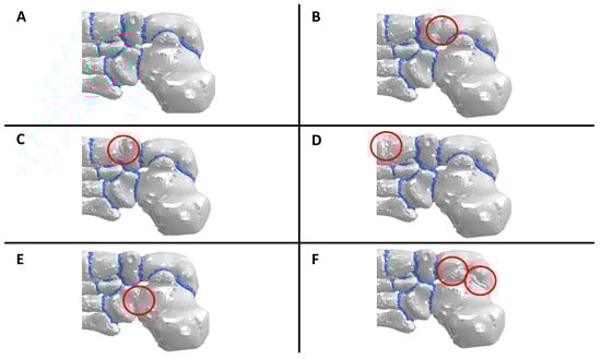 Clarification of how the arthrodesis and fusions were simulated. The cartilage material was changed to a cortical bone in each fused joint. (A) Flatfoot condition, (B) talonavicular arthrodesis, (C) cuneonavicular fusion, (D) first tarsometatarsal fusion, (E) calcaneocuboid fusion, and (F) subtalar arthrodesis.