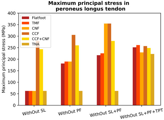 The plantar fascia and spring ligament are the main tissues associated with the maintenance of the plantar arch. A failure in the passive stabilizers increases the tension in PL during mid-stances and terminal stances. The results of the maximum principal stress of the peroneus long tendon are shown in Figure 5 and Figure 6.