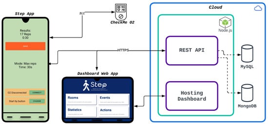 STEP system in architecture. The image depicts the STEP system’s components: a cloud-based server (right) for data storage, the STEP app (left) for test execution and result collection, and a dashboard web app to visualize the results.