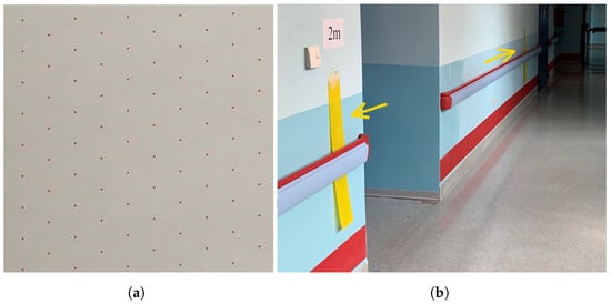 (a) The pattern in which a subset of the pixels in a frame are selected for comparison. (b) A hallway where patients performed the Ten-Meter Walking Testduring the study. The two colored plastic implements are highlighted. Different lighting conditions around the implements are also visible.