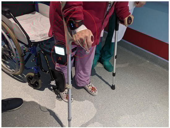 - The Six-Minute Walking Test (6MWT), shown in Figure 1a, in which the patient is asked to walk back and forth on a flat surface (usually 30 m long) for six minutes. The patient is instructed to cover the greatest possible distance within the time limit, turning around at the end of the walkway and stopping to rest as needed before resuming the walk []. The test result is the walked distance in meters.