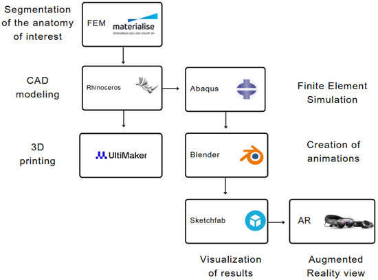 Following the computational simulation, the deformed anatomical structures and prostheses were exported at various simulation time frames and imported into Blender software, V3.5 (Blender Foundation BV, Amsterdam, Netherlands). Blender was utilized to color each component and generate the animation (see Figure 1). Specifically, the heart chambers were merged into a single shape to unify the model color whilst the prostheses remained unchanged to assign specific colors to distinguish them from the other anatomical parts. All geometric components were incorporated into the animation command with each simulation time frame generating five animation frames in Blender to slow down the overall animation. The Sketchfab platform (Sketchfab Inc., New York City, NY, United States) was used to upload the animation file exported from Blender. Finally, the AR content was loaded into MagicLeap AR glasses, enabling the surgical team to explore the spatial positioning of the devices in real time, providing an immersive and interactive experience to better anticipate potential challenges during the actual procedure.