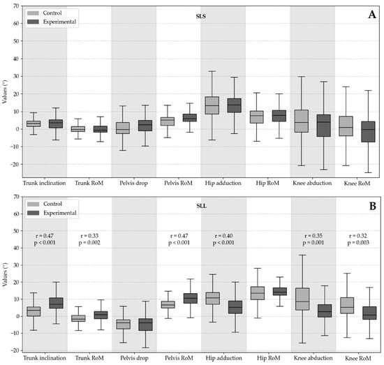 For the SLS, no significant differences between groups were found (Figure 2). For SLL, the experimental group had greater ipsilateral trunk leaning (Δ° = 4°; U = 423.500; p < 0.001; ES = medium), greater ipsilateral trunk leaning RoM (Δ° = 3°; U = 573.000; p = 0.002; ES = medium), greater contralateral pelvic drop RoM (Δ° = 4°; t [84] = −4.555; p < 0.001; ES = medium), less hip adduction (Δ° = 5°; t [84] = 4.100; p < 0.001; ES = medium), less knee abduction (Δ° = 7°; t [84] = 3.443; p = 0.001; ES = medium), and less knee abduction RoM (Δ° = 5°; t [84] = 3.077; p = 0.003; ES = medium) when compared to the control group (Figure 2).
