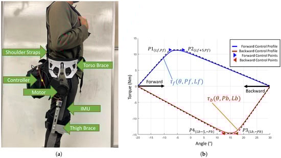 (a) An illustration of the exoskeleton device detailing all the main components. (b) An overview of the controller, which establishes a relationship between torque and angle using segmented Bezier curves. The four control points define the torque profile: and correspond to the forward swing phase and are functions of the parameters (forward peak location) and (forward peak magnitude), while and define the backward swing phase and depend on (backward peak location) and (backward peak magnitude). The torque functions applied during forward and backward actuation are represented as and , respectively.