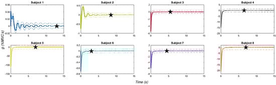 The steady state EMG data of each subject are represented as a bold average line with dotted lines showing the standard deviation. The variable g represents the sum of the derivative of the running average for the four sensors across all trials of a subject. The star indicates the time when a steady state is reached on average. Despite small oscillations, all subjects met steady−state criteria.
