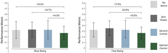 Condition comparison results from the validation phase. The condition averages of the EMG performance metric are represented by the bar graph. The standard deviation is shown by whiskers. Percent changes between tests with three baseline conditions and tests with optimal control are shown above the horizontal brackets.