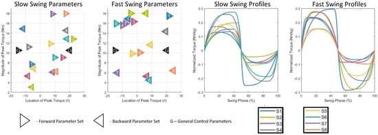 The optimal controller (OP) outperformed all baseline conditions on average (Figure 5). For the slow swing, OP reduced muscle activity by 15.2% (p ) compared to the no device condition and by 19.7% (p ) compared to the zero torque condition. Additionally, the OP reduced muscle activity by 14.5% (p ) compared to the general controller. For the fast swing, OP significantly reduced muscle activity compared to the no device and zero torque conditions by 17.0% (p ) and 23.6% (p ), respectively, and by 15.6% (p = 0.0015) compared to the fast swing general controller. The optimal controller profiles for all subjects are shown in Figure 6.