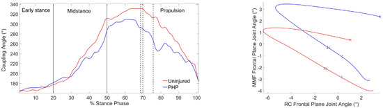 From 69 to 70% stance, the mean coupling angle of the PHP group was 291.6 ± 1.94°, which is between “relative equal rotation of the two joints in opposite directions (315°)” and “rotation primarily of the distal joint with the proximal joint fixed (270°)”, indicating the rearfoot complex and medial midfoot were rotating in opposite directions with the medial midfoot rotating more than the rearfoot complex. The angle–angle plot in Figure 2 indicates the rearfoot complex was in an everted position and inverting, while the medial midfoot was in an inverted position and everting. During the same period, the mean coupling angle of the uninjured group was 331.0 ± 1.9°, which is between “rotation primarily of the proximal joint with the distal joint fixed (0°)” and “relative equal rotation of the two joints in opposite directions (315°)”, indicating that the rearfoot complex and medial midfoot were rotating in opposite directions, but with the rearfoot complex rotating more than the medial midfoot. The angle–angle plot in Figure 2 indicates the rearfoot complex was in an everted position and inverting, while the medial midfoot was in an everted position and everting.
