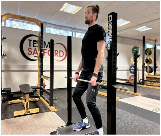 The IMTP was performed using standardized protocols while using an adjustable rig and fixed bar (Absolute Performance, Cardiff, Wales) that was coupled with force-plate sampling at 1000 Hz (Hawkin Dynamics, Westbrook, ME, USA) (Figure 1) [49]. Specifically, the participant adopted a self-selected position that replicated the start of the 2nd pull of the clean, resulting in knee and hip joint angles of 125–145° and 140–150°, respectively. All participants used a clean grip and lifting straps to hold onto an immovable bar. Participants were instructed to remove “slack” from the body without creating any pre-tension on the bar so that a “quiet standing” period could be established, allowing a stable force baseline to be quantified. All participants were instructed to “push into the ground as hard and as fast as they can” on the count of “3,2,1 PUSH”. The 3 × 3 s warm-up trials performed at 50, 75 and 90% rate of perceived exertion, respectively, were used to familiarize the participants with the IMTP. Straps were used during the warm-up trials to offer a familiarization, as straps are not permitted in competition and mixed experience with using straps within the cohort. Maximal effort trials lasted between 4 and 6 s in duration with strong verbal encouragement provided, with 1 min rest between trials, a threshold was applied to the IMTP, where further trials were performed if PF changed by >250 N or 5% [49].
