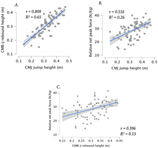 Scatter plots with linear line of best fit (blue line) and 95% confidence intervals (grey shaded area) between (A) CMJ height and CMR-J rebound height, (B) IMTP relative net peak force and CMJ height and (C) IMTP relative net peak force and CMR-J rebound height with r and R2.