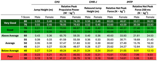 Descriptive benchmarks, T-score performance bands and application of the traffic light system were recorded using Microsoft Excel (Microsoft Corp., Redmond, WA, USA) in accordance with the work of McMahon et al. [37]. The participants’ mean score of three recorded trials was used to calculate their Z- and T-scores using Equations (1) and (2), respectively.