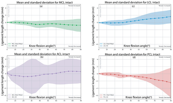 Mean and standard deviation (SD) results of dynamic knee flexion from 0° to 90° for the following ligaments: (a) MCL, (b) ACL, (c) LCL, and (d) PCL.
