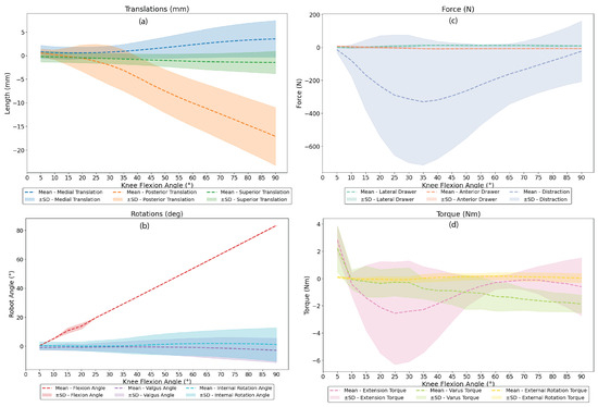 Figure 4c,d also illustrate the force and torque the knee specimens experience when the specimens flex along with the robotic system. The maximum recorded lateral drawer force was 12.68 ± 6.95 N, while the anterior drawer force peaked at 7.29 ± 6.97 N. Notably, distraction forces exhibited significant variation at −13.67 ± 387.44 N, reflecting interspecimen differences. During the knee flexion, varus torque was present across all specimens, peaking at 90° flexion at 2.18 ± 1.70 Nm, which may likely have influenced ligament strain behavior. The extension torque peaked at 2.81 ± 3.76 Nm, and the external rotation torque peaked at 0.16 ± 0.34 Nm, which remained relatively low and may have suggested limited rotational constraints during the dynamic conditions.