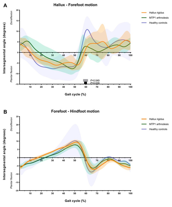 Statistical analyses were conducted in GraphPad Prism 8.3 (GraphPad Software, Inc., San Diego, CA, USA). Patient characteristics were compared by using the Mann–Whitney U test. Spatiotemporal parameters and intersegmental ROM in the push-off phase were statistically tested with the Wilcoxon signed rank test (pre- vs. postoperative) and Mann–Whitney U test (HR vs. healthy controls). Pre- and postoperative PROMs were compared with the Wilcoxon signed rank test. Kinematic data was tested using statistical parametric mapping (SPM; version M.0.4.5), which can detect differences at any time point of the gait cycle (0–100%) [30]. An SPM paired t-test was used to compare pre- and postoperative measurements in HR subjects, and an SPM unpaired t-test was used to compare subjects with HR and healthy controls and to compare subjects treated with MTP1 arthrodesis to healthy controls. A p-value ≤ 0.05 was considered statistically significant.