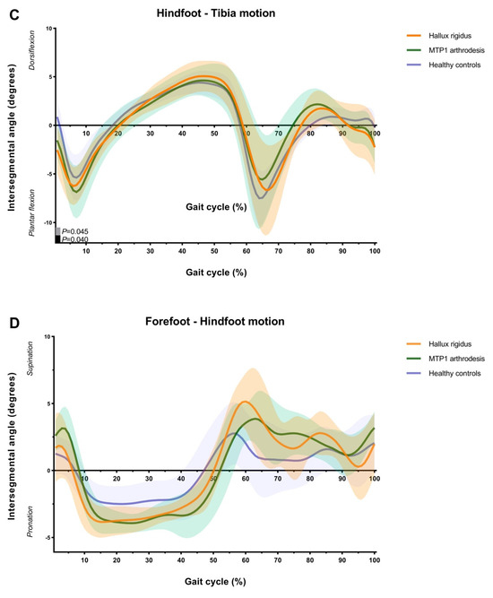 Sagittal forefoot and hindfoot motion (dorsiflexion and plantar flexion) were comparable in the three studied groups (Figure 1B,C). Only increased plantar flexion was observed in subjects with HR and MTP1 compared with healthy controls (p = 0.045 and p = 0.04, respectively; Figure 1C) during loading response in the hindfoot/tibia segment. Furthermore, no differences in sagittal ROM (dorsiflexion and plantar flexion) during push-off in the forefoot and hindfoot were seen between the studied groups (Figure 2B,C).