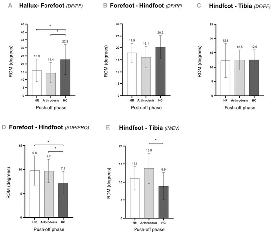 These five figures present intersegmental ROM during push-off in the sagittal plane (A–C) and frontal plane (D,E) in the different foot segments. Results are before surgery (HR), after MTP1 arthrodesis (arthrodesis), and healthy controls (HC). Data are presented as means with standard deviations. * A p-value ≤ 0.05 is considered a statistically significant difference. Abbreviations: PF—plantar flexion; SUP—supination; PRO—pronation; IN—inversion; EV—eversion.