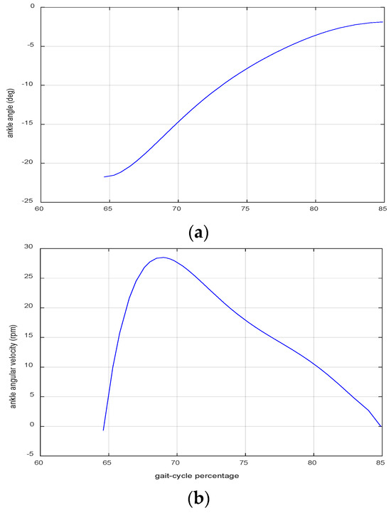 Figure 1 shows the angle and angular velocity of the ankle joint in the sagittal plane, during the swing phase of level-ground walking [32,33]. These data will be used together with the geometry of the device setup, as explained in the next section.