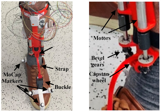Figure 2 shows a picture of the AFO prototype. The user’s foot is connected by a buckle to a strap, the other side of which is attached to a capstan wheel. As the capstan wheel rotates, the strap winds around it and pulls up the user’s foot. Two pairs of bevel gears transmit the power from two electric motors to the capstan wheel. The two motors follow the same speed curve in opposite directions. Each motor also has an internal gearbox.