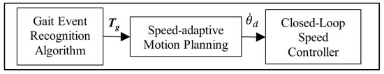 Upon receiving the “assist” command, a new value of the gait period is calculated and used to modify the parameters of the trapezoidal speed profile (Section 2.2). Using these parameters, the desired angular velocity of the motors is updated at a rate of 1 KHz and fed to the closed-loop speed control algorithm of the motors, as illustrated in Figure 5.