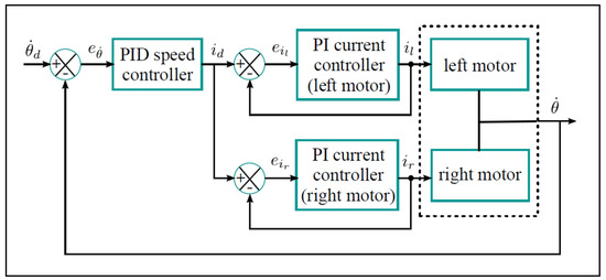 The shafts of the two motors are connected and bound to rotate at the same speed. However, they may contribute unequal portions of the total torque. To ensure a balanced share of torque contribution, the desired current is then fed to two separate current controllers, one for each motor. The current control loops use the PI algorithm tuning in a cascade control scheme, as shown in Figure 6. In the outer loop, the speed error of the motor shafts () is fed to a PID algorithm that calculates the desired current of the two motors, (as differential control action can cause instability due to the fluctuating nature of current feedback). The current controllers will track the same current in the motor windings. This means that the torques of the two motors remain close to each other.