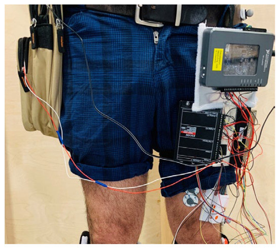 User tests were performed on a 39-year-old male with no orthopedic or neurological pathology. The AFO was custom 3D-printed to the geometry of his shank and foot. A set of MoCap markers and an EMG sensor were attached to the subject’s body (Figure 2). The subject then wore AFO and the supporting electronics (Figure 7) and started walking on a treadmill, as shown in Figure 8. In the first set of tests, hereafter referred to as the normal gait experiments, the strap of the device was not buckled to the user’s shoe; therefore, no assistance was delivered to the user. However, the device was active and would pull up its strap and free buckle upon receiving the “assist” command. At every “release” command, the capstan would start to unwind the strap, allowing it to return to its original position. This was done to measure the no-load power, which is the amount of power needed to overcome the inertia and internal power losses in the device (more on this in Section 4.2).
