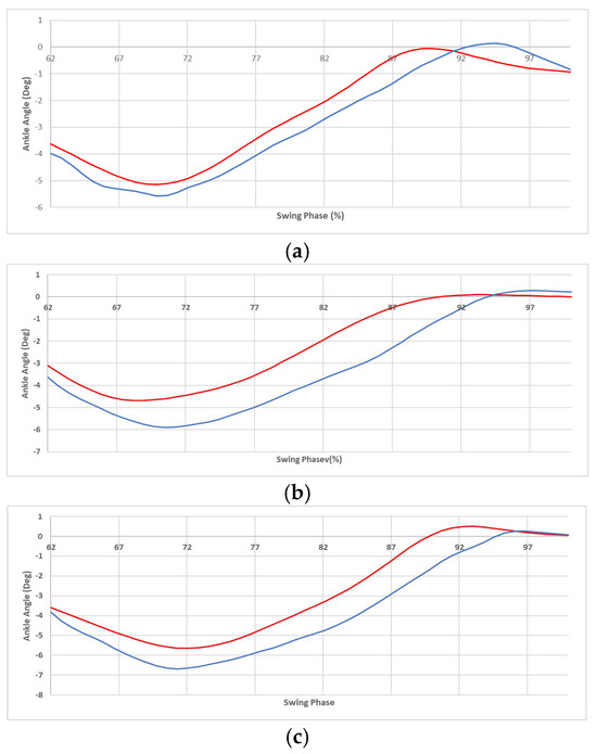 The average foot angle of swing phase of gait cycles versus the gait cycle percentage, for the normal gait experiment (blue) and the assisted gait (red) for the speeds of 0.44 m/s (a), 0.61 m/s (b), and 0.75 m/s (c). The critical point is the “foot-clearance” event that occurred during the mid-swing phase.