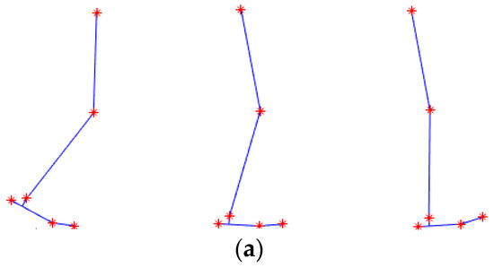 The simulation was performed by writing the kinematic and dynamic equations of motion of the user’s leg, with input data from MoCap measurements. The equations were solved for each data sample by running the script in MATLAB (MathWorks®, version 2019b). Three snapshots of an animation of the simulation are shown in Figure 11a. Data on mass and moment of inertia of the human body segments are available in the literature [35], normalized to the total body weight. The normalized values were multiplied by the test subject’s body weight (85 kg), and the resulting values were assigned to the model parameters. These values are 1.23 kg for the foot mass and 1.1 × 10−3 kg.m2 for the moment of inertia of the foot around its center of mass, which is halfway between the heel and the toe tips. Finally, MoCap data from the experiments were used as the kinematic input to the simulations. The result was the torque at the ankle joint, from which mechanical power was calculated.