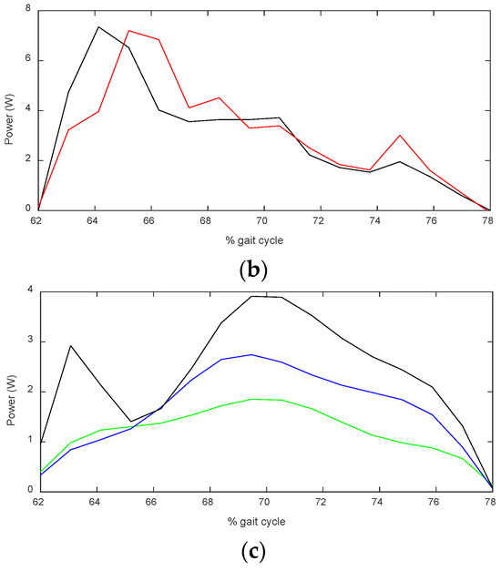 To assess the reliability of this method, the simulation was first performed with MoCap data of walking at the average human walking speed, and the results were compared to literature data, as depicted in Figure 11. Although the graphs are not identical, and peaks are observed at different points in the gait cycle, we are interested in the average power, as it indicates the total energy delivered to the foot. The average power of the data from the literature is 2.82 W, whereas the simulation yields 2.92 W, which is 3% larger. Since the results are close, the simulation can be used to estimate the amount of required power at other walking speeds, which are shown in Figure 11c.