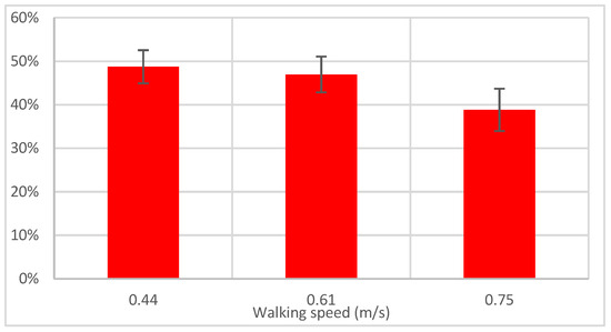 The average values of the required power for the three speeds are reported in Table 1, as well as the power provided by the device. To assess the portion of the required power that was provided by the device, we defined the assistance ratio as the ratio of the assistive power to the required power. This parameter is illustrated in Figure 12. Notice that both the required power and pure assistive power were acquired over fifty gait cycles (with measurements of MoCap data and motor’s current feedback). Therefore, the standard variation in their mean value was calculated, and then the standard deviation of their ratio was calculated, which is shown in the error bars in Figure 12. The data obtained from the power analysis will be studied together with the EMG data in Section 4.4.