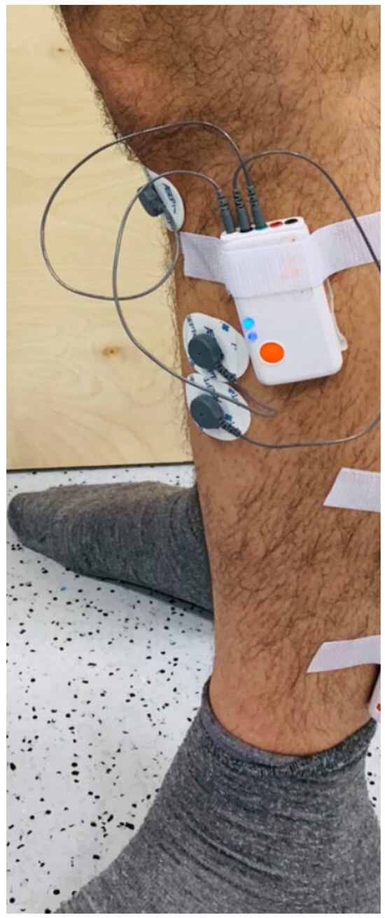 The EMG sensor for the tibialis anterior (TA) muscle.