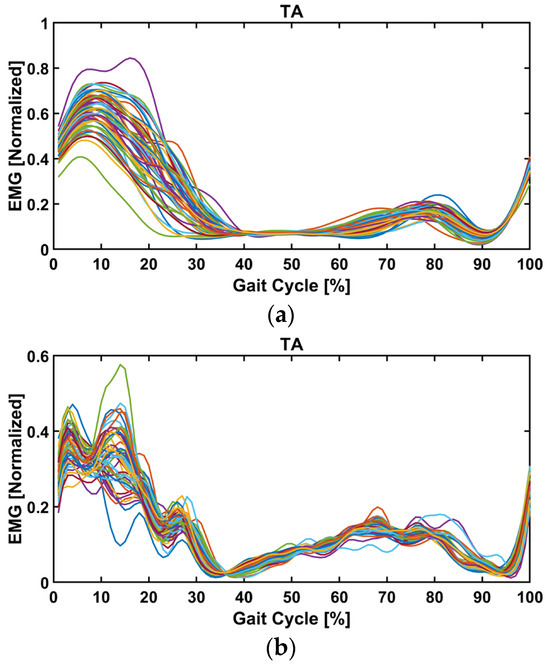 Figure 14a,b show the EMG signals of a few gait cycles for normal and assisted walking, respectively. For the muscle activation comparison, a one-dimensional linear envelope trajectory was obtained.