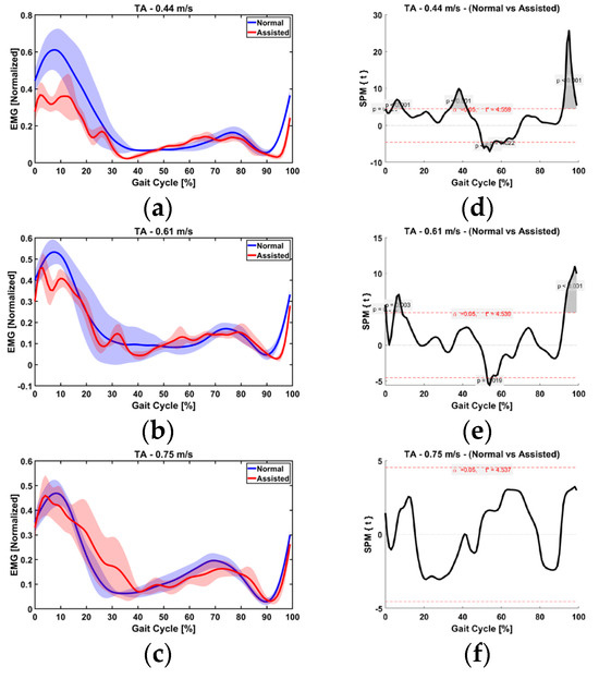 EMG normalized to the maximum value obtained between (averaged over all trials) between normal and assisted at (a) 0.44 m/s, (b) 61 m/s, and (c) 0.75 m/s. TA within-subject paired t statistic and the red dashed lines indicate critical thresholds of t* = 4.559, 4.539, and 4.537 for are shown for each speed (d–f), respectively. Significant differences are shown in gray, where p < 0.05.