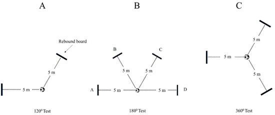 In the 120-degree test, two boards were placed 120° apart, both facing a shared focal point located 5 m from each board (Figure 1). Players began each trial standing at the focal point. The starting board was randomized between players, and each performed ten passes in each direction, excluding the first pass (20 total). As only two boards were used and players always knew the next target, this was considered the least complex test, requiring no visual search. However, strong performance still demanded efficient ball control and accurate passing.