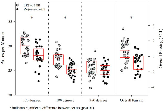 For first-team players, the number of passes per minute significantly varied across the three tests, with the highest of 30.11 ± 7.22 passes/min on the 120-degree test and the lowest on the 360-degree test of 25.55 ± 5.94 passes/min (Table 3, Figure 2). For reserve-team players, performance in the 120-degree test was higher than for other tests, but no difference was detected between the 180-degree and 360-degree test (Table 3, Figure 2).