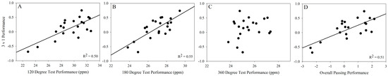 Relationship between 3v1 Rondo performance and the 120-degree test (panel A), 180-degree test (panel B), 360-degree test (panel C), and overall passing performance (PCP1) (panel D).