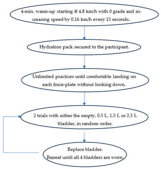 Two sets of trials were performed using four different hydration bladders, each filled with different amounts of water: empty pack (0.71 kg), 0.5 L (1.21 kg), 1.5 L (1.71 kg) and 2.5 L (3.21 kg). The pack stayed on the participant and only the bladders were changed, to ensure consistency in the pack between all trials. The water remained sealed inside the bladders until all testing was completed.
